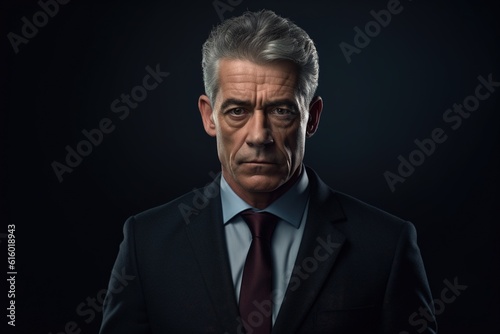 Portrait of mature businessman in suit looking at camera on black background.Generative Ai