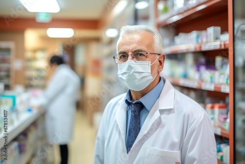 Portrait of mature Caucasian male pharmacist wearing glasses and protective mask among shelves of medicines in pharmacy. Experienced confident professional in workplace. Healthcare and hygiene concept