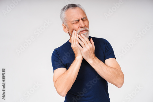 man, senior, portrait, bearded, pain, toothache, touching, closed eyes, dental, cheek, white, young, t-shirt, retired, pensioner, colours, skin, model, treatment, attractive, holding, mature, concept, caucasian, lifestyle, clinic, advertisement, suffering, isolated, health care, casual attire, male, background, fashion, ethnicity, studio, face, photogenic, adult, people, smart, standing, posing, stylish, modern, client, professional