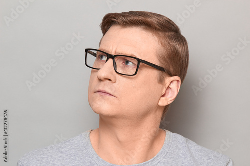 serious, man, guy, male, mature, adult, person, portrait, look, face, photogenic, charismatic, concentrated, focused, confident, attentive, calm, people, caucasian, white, blond, european, background, head, grey, studio, goggles, casual attire, head shot, closeup, expression, isolated, neutral, facial, emotion, bespectacled, t-shirt