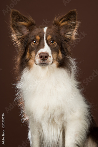 Portrait of miniature american shepherd dog looking at the camera on a brown background