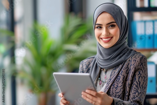 person, office, portrait, headscarf, woman, businesswoman, entrepreneur, muslim, smiling, business, young, confident, indoor, professional, work, female, arabic, corporate, ethnic, manager, successful, happy, adult, cheerful, beautiful, arab, arabian, career, cyberspace, islam, laptop, online, standing, startup, middle eastern, modern, technology, e-business, lifestyle, development, information, innovation, working, woman, people, holding, asian