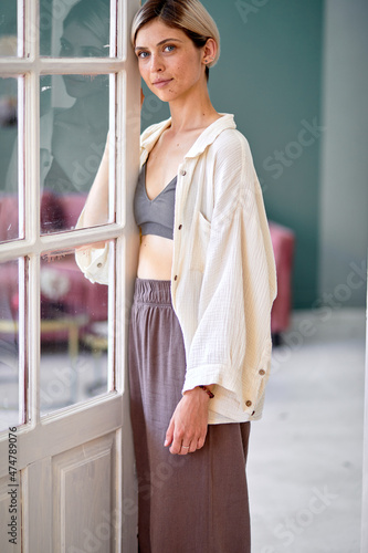 Portrait of pretty beautiful female in casual domestic wear posing next to door at home, charming lady having rest in the morning, alone in bright cozy living room. People lifestyle concept