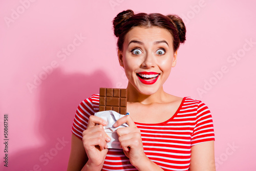 Portrait of satisfied cheerful lady hold delicious chocolate bar have good mood isolated on pink color background