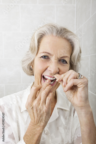adult, bathroom, cleaning, dental care, flossing, female, flossing, front view, healthy lifestyle, holding, house, hygiene, indoor, lifestyle, london, morning, mouth open, nightwear, 1, one person, people, portrait, retirement, room, routine, short hair, tile, wall, woman