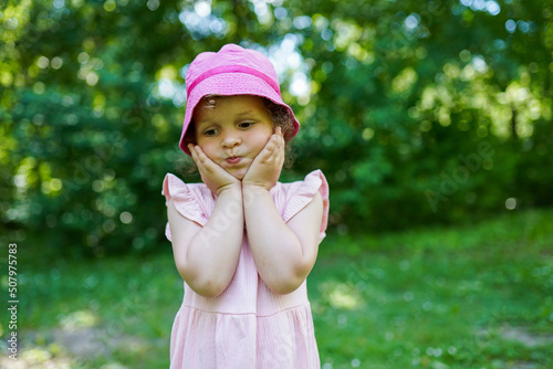 Portrait of small attractive lovely cheerful girl in pink hat have fun and walking in the park