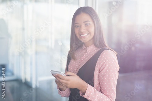 Portrait of smiling businesswoman using mobile