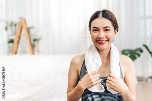Portrait of sport asian woman in sportswear sitting relax and practicing yoga and do fitness exercise look at camera at home.Diet concept.Fitness and healthy lifestyle