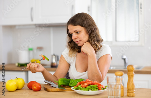 Portrait of thinking young woman during cutting vegetable on kitchen, looking with disgust and dislike