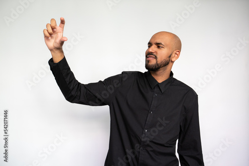 person, man, portrait, ethnicity, young, adult, male, attractive, photogenic, white background, isolated, horizontal, casual attire, expression, gesture, posing, modern, studio, studio shot, bald, beard, unshaved, black, shirt, indoor, emotional, unhappy, dissatisfied, hand, holding, copy space, invisible, object, showing, advertisement, advertisement, size, small, little, demonstrating, upset, disappointed, frustrated, amount, length