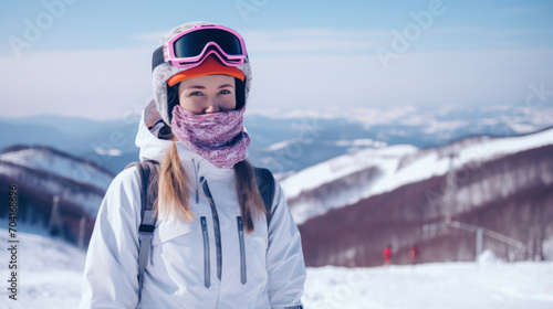 Portrait of woman in alps. Ski vacation in skier uniform, helmet and goggles