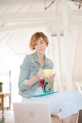 portrait, woman, to sit, desk, laptop, cup, office, adult, alone, blond, business, businesswoman, cape town, casual attire, clothes, confident, day, drink, food and drink, hair, hand, happy, indoor, 1, people, person, smile, south africa, technology, water, work, young
