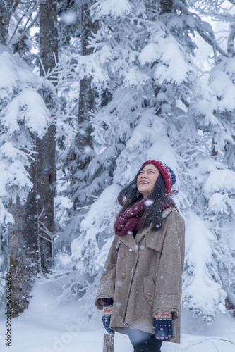 Portrait of woman with red wool hat feeling very happy and cold under snowy weather at Shin-hotaka, Japan Alps.