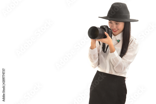 Portrait of young asian photographer wearing black hat is taking a photo. Model isolated on white background with copy space.