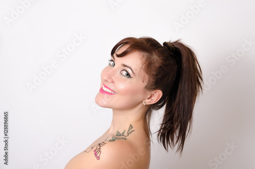 portrait, young, woman, girl, body, drawing, eye, sexy, hair, dark, smile, beautiful, ball, air, inflate, blue, posing, photo, model, advertising, business, closeup, grey background, female