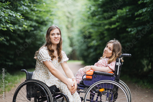 Portrait of young caucasian ladies in wheelchairs sitting in front of each other at summer park and looking at camera. Concept of people with disability and lifestyles.