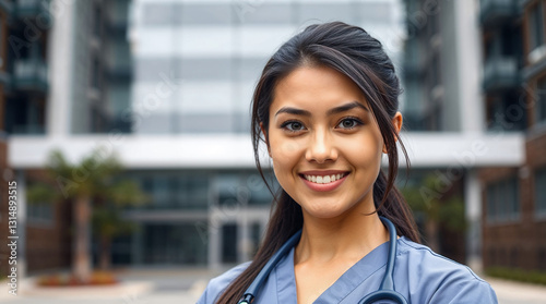 portrait of young female nurse smiling with blurry hospital building background