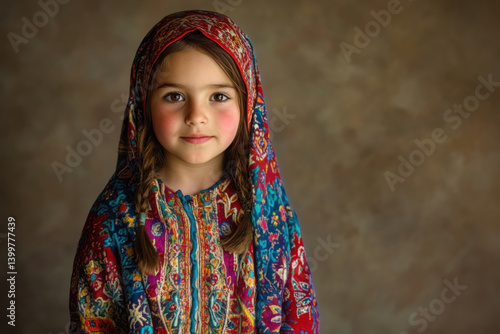 girl, children, portrait, headscarf, diversity, ethnicity, studio shot, young, innocence, beauty, colourful, fashion, textile, embroidery, detail, pattern, design, culture, tradition, identity, expression, childhood, children, female, one person, brown eyes, vertical