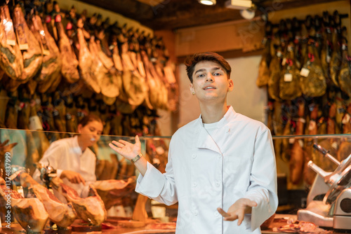 person, man, market, ham, spanish, food, meat, shop, store, pork meat, male, european, caucasian, american, german, french, 20s, smoked, leg, variety, uniform, assistant, job, young, delicious, counter, marketplace, sell, occupation, eco, offer, assortment, pork meat, dealer, interior, sale, display, distributor, salesman, fresh, guy, professional, indoor, culinary