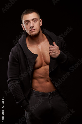 1, person, man, male, athlete, athletic, physique, sportsman, strong, sport, wellness, fit, vertical, bodybuilder, indoor, black, background, isolated, young, adult, portrait, healthy, shape, muscular, muscle, trainer, gym, power, caucasian, masculinity, abs, posing, model, triceps, standing, hoodie
