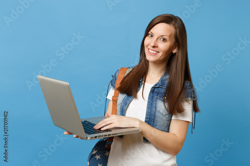 Portrait of young pretty woman student in denim clothes with backpack holding and using working on laptop pc computer isolated on blue background. Education in college. Copy space for advertisement.