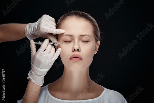 Portrait of young woman getting cosmetic injection. Clean Beauty. Closed eyes.