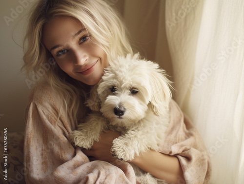 woman, dog, puppy, pet, girl, animal, portrait, friends, domestic, owner, happy, happiness, friendship, togetherness, lifestyle, pedigree, cute, beautiful, pretty, attractive, female, hugging, love, young, smile, smiling, cheerful, care, people, indoor, summer, fashion, person, beauty, adorable, face, maltese, fluffy, poodle, small, terrier, breed, bichon, home, blond, white, holding
