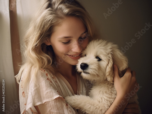 woman, dog, puppy, pet, girl, animal, portrait, friends, domestic, owner, happy, happiness, friendship, togetherness, lifestyle, pedigree, cute, beautiful, pretty, attractive, female, hugging, love, young, smile, smiling, cheerful, care, people, indoor, home, fashion, person, beauty, adorable, face, maltese, fluffy, poodle, small, terrier, breed, bichon, white