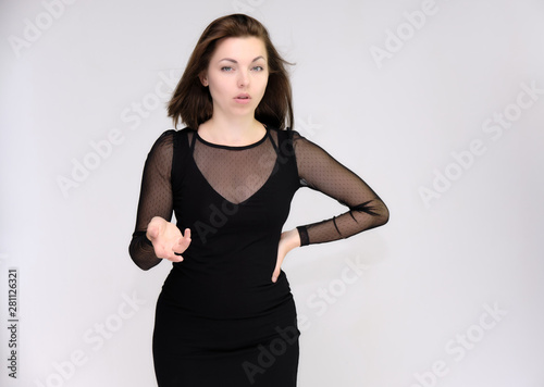 Portrait on white background of a pretty slim beautiful fashionable adult girl with beautiful brunette hair in a black dress. Standing talking demonstrating different poses and emotions