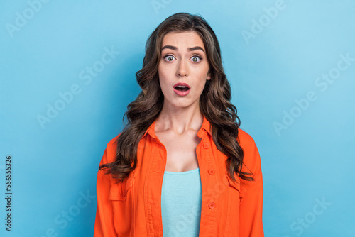 Portrait photo of young wavy hair funny girl impressed reaction surprised open mouth black friday sale promo isolated on blue color background