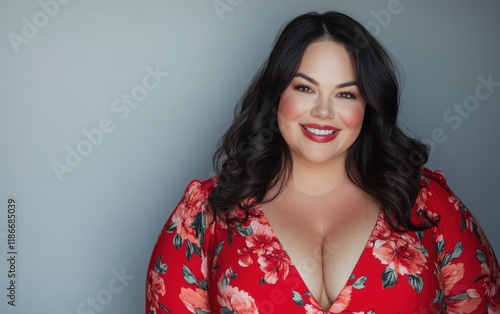 Portrait photograph of a plus-size brunette woman in her thirties, dressed in a vibrant red floral dress with a sweetheart neckline