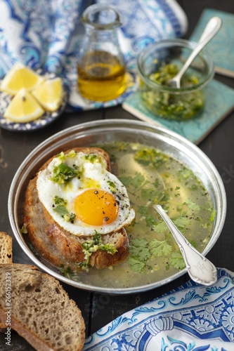 soup, egg, bread, garlic, cilantro, coriander, lunch, herb