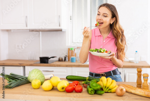 vegetable, woman, salad, cooking, person, food, home, kitchen, eating, meal, healthy, european, caucasian, american, german, french, 30s, lifestyle, happy, dinner, indoor, smile, girl, female, vegetarian, young, lunch, prepare, cheerful, house, ingredient, organic, diet, fresh, healthy eating, vegan, tasting, healthy lifestyle, interior, culinary, receipe, nourishment, vitamin, domestic life, enjoyment