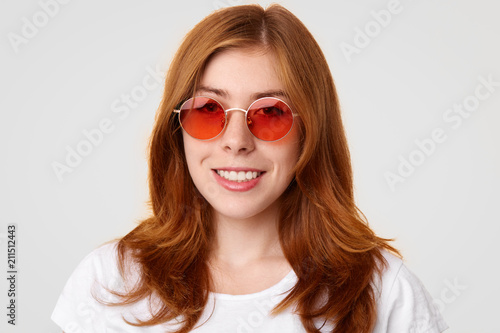 Positive lovely fashionable young woman with gentle smile, wears red trendy sunglasses, being in good mood, rejoices summer vacation, isolated ovr white background. People and emotions concept