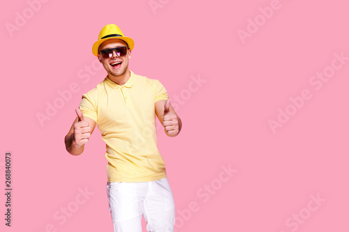 man, confident, stylish, gesture, successful, outfit, casual attire, male, sunglasses, hat, joy, positive, posing, excited, guy, trendy, modern, cheerful, happy, showing, pointing, friendly, signs, glad, pleased, satisfied, photogenic, pink, white, summer, yellow, concept, bright, clothes, lively, expression, hand, muscular, joyful, studio, elegant, delighted, high-coloured, adult, emotion, attractive, creative, fun, mouth open, background