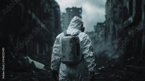 suit, ruin, city, desolate, apocalypse, survivor, wasteland, destruction, danger, hazard, contamination, disaster, catastrophy, grim, gloomy, bleak, sombre, dark, shadowy, eerie, creepy, ominous, scarey, atmosphere, toxic, peril, risk, threat, emergency, crisis, ruined, building, street, scene, back, figure, person, walking