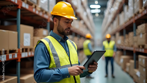Potrait of man wearing safety helmet and vest with holding tablet while inspecting warehouse, boxes and other workers background, warehouse management or logistics environment