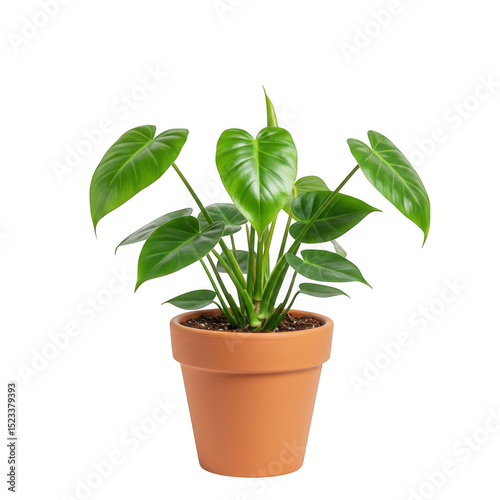 Potted anthurium plant with green leaves in a terracotta pot isolated on transparent background