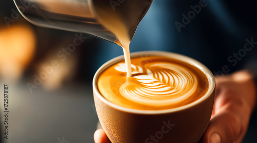 pouring coffee into a cup cappuccino latte in a glass Barista behind the bar pouring latte