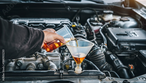 Pouring fresh motor oil into a car engine during a routine maintenance check for optimal performance and longevity