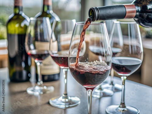 Pouring red wine into glass, accompanied by bottles and glasses on a table, perfect for celebration, dining, and beverage photography.