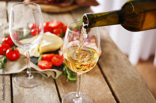 Pouring wine into glass and food on wooden table closeup