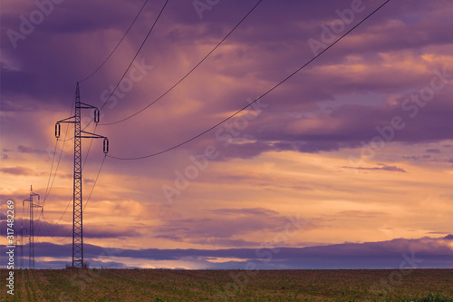 Power line and field at sunset sky. Autumn landscape.