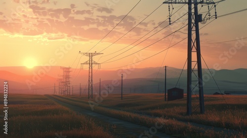 Power lines stretching across a rural landscape, with a sunset creating a warm glow in the background.