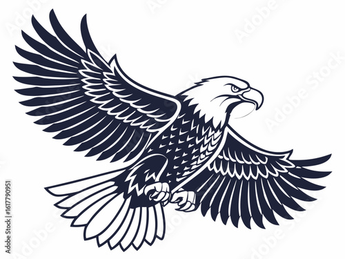 bald eagle, eagle, bird, flight, wing, soaring, freedom, power, strength, american, patriotic, logotype, design, vector, illustration, graphic, art, line art, navy blue, white, monochrome, silhouette, wildlife, animal, nature, mascot, emblem, symbol, print, apparel, activewear, business, corporate, military, inspirational, motivational, powerful, dynamic, vintage, classic, poster, design element, badge, icon