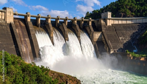 dam, water, power, energy, release, flowing, concrete, nature, landscape, industry, hydroelectric, structure, environmental, waterfall, powerful, force, splash, motion, environment, green, mountain, blue, sky, cloud, technology
