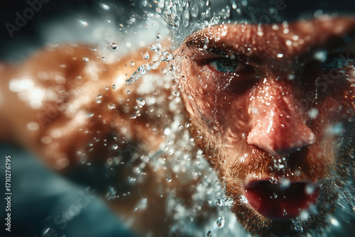 Powerful Male Swimmer Face Refreshing Water Splash Drops Dynamic Athletic Sport Fitness Energy