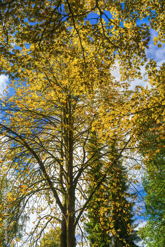 Prachtvolle Herbstliche Farben von Linden und Kastanien Bäumen gegen den blauen Himmel