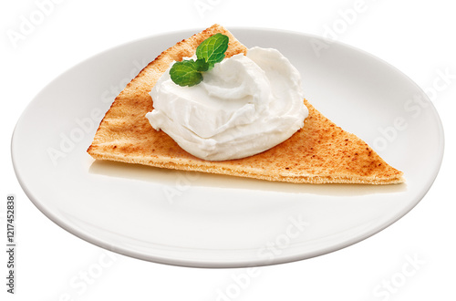 prato com fatia de pão com coalhada seca acompanhada de folha de hortelã isolado em fundo transparente