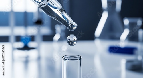 Precision Drop: A Crystalline Liquid Sphere Suspended Above a Test Tube in a Blue-Lit Lab